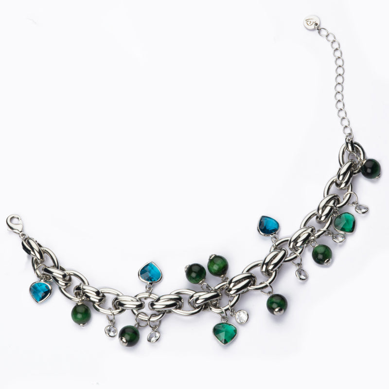 Questo bracciale in catena con anelli in brass è arricchito da punti luce in zircone alternati a gocce e pietre tiger eye colorate: perfetto per un look luminoso e originale.