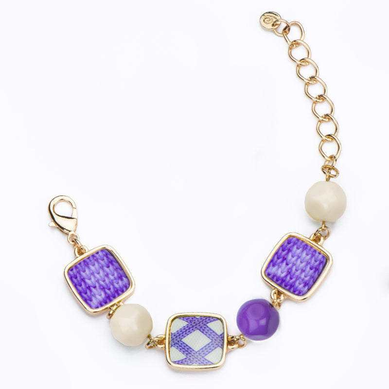 Questo bracciale con elementi in resina a stampa Wool Braid nei toni avorio e lavanda, incorniciati da frame dorati, è arricchito da delicati beads che ne esaltano il design raffinato.