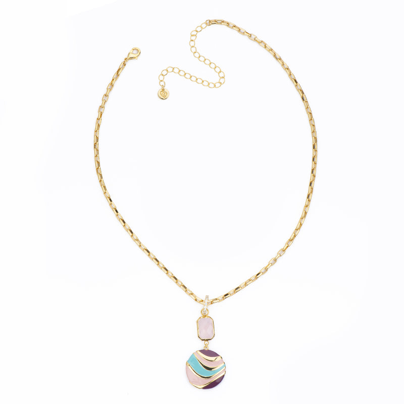 Questa collana in metallo dorato abbina un pendente in cristallo colorato ad un elemento tondo smaltato multicolor: un dettaglio vibrante che accende ogni look.