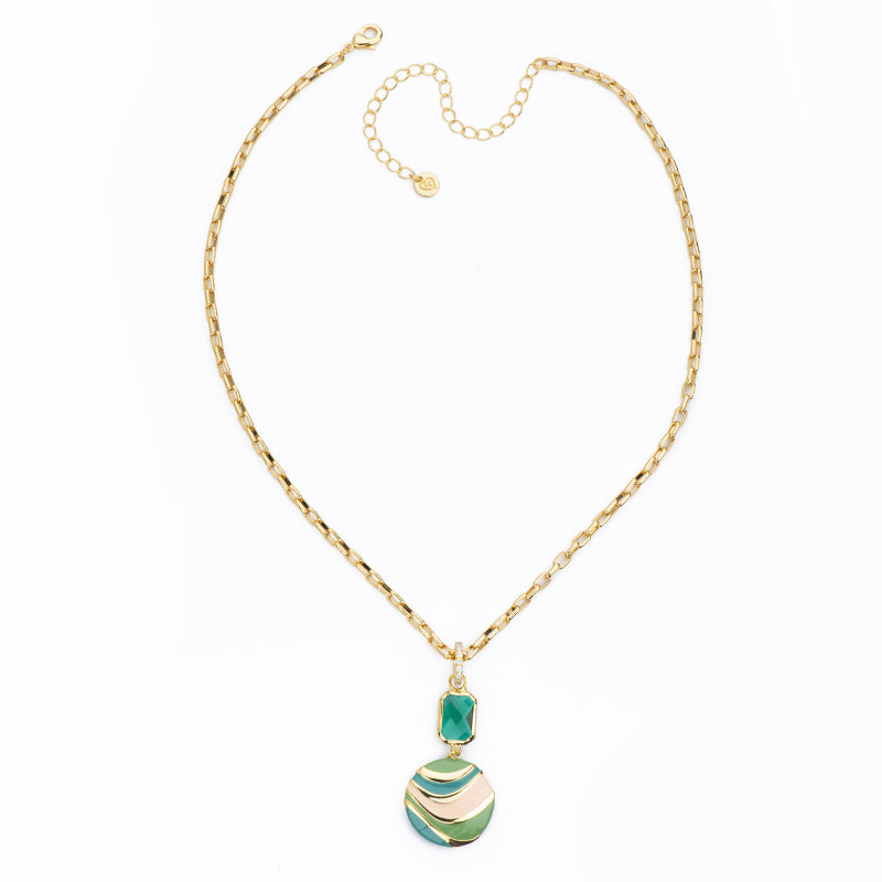 Collana con catena in metallo dorato con pendente in cristallo jelly rose/smeraldo ed elemento tondo con smalto multicolor.