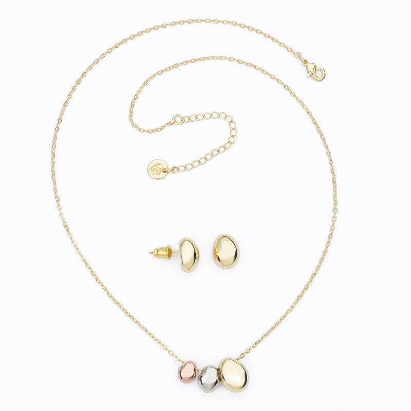 Questo set di collier con centrali a forma di pietre in metallo dorato, rodiato e rosè è completato da un orecchino dorato per un tocco elegante e contemporaneo.