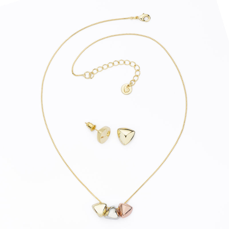 Set di collier con centrali a forma di piramide in metallo dorato, rodiato e rosè con orecchino dorato.
