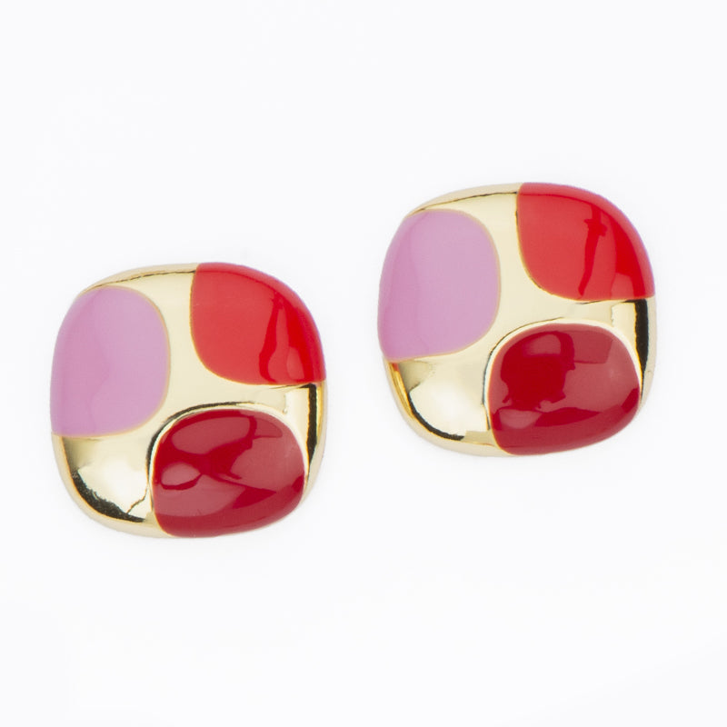 Orecchini con top carrè in metallo bombato con disegno astratto in smalto sangria, rosa e tomato/ivy, almond e blu.