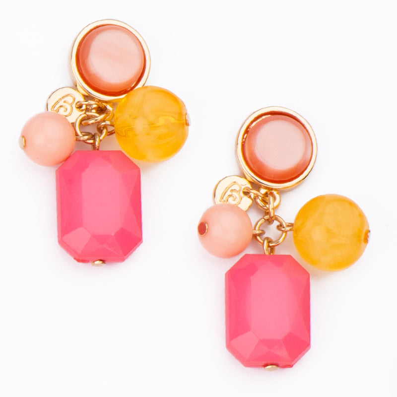 Orecchini con top rotondo in resina glitter cherry blossom/off white con frame in metallo dorato e pendenti multi rosa/gesso e bianco mix.
