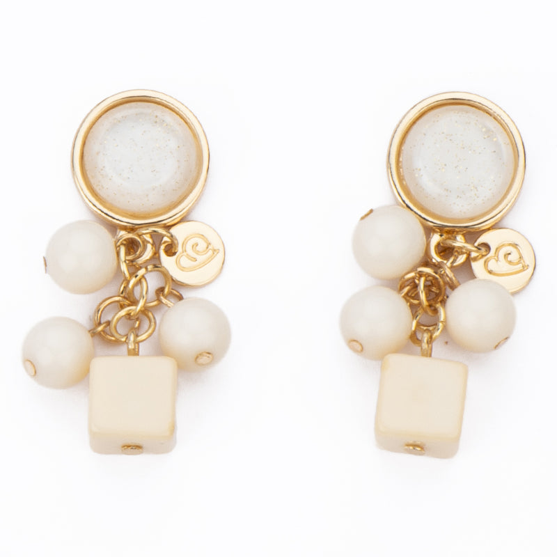 Questi orecchini con top rotondo in resina glitter, incorniciato da frame in metallo dorato e completati da pendenti, regalano un effetto delicato, luminoso e dal mood romantico.