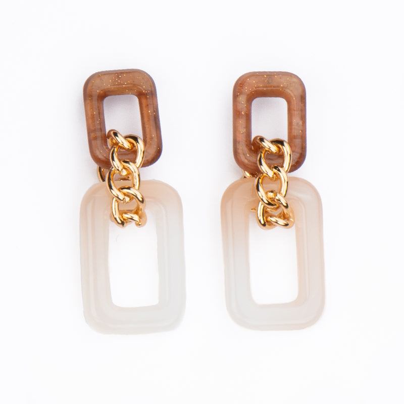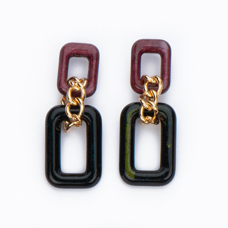 Questi orecchini presentano un top in resina micro glitter e un pendente in tinta, uniti da una catena groumette in metallo dorato che aggiunge un tocco luminoso e deciso al design.