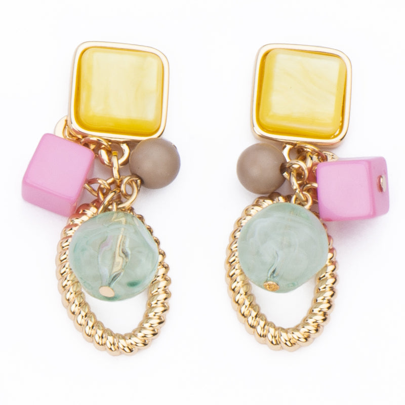 Questi orecchini con top carré in resina glitter gialla sono completati da elementi pendenti multi pastello e anello torchon in metallo dorato: per un effetto vivace, creativo e dal mood giocoso.