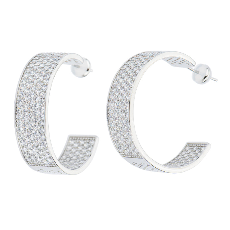 Orecchini a creola a fascia larga in metallo rodiato/dorato con pavè di zirconi clear.