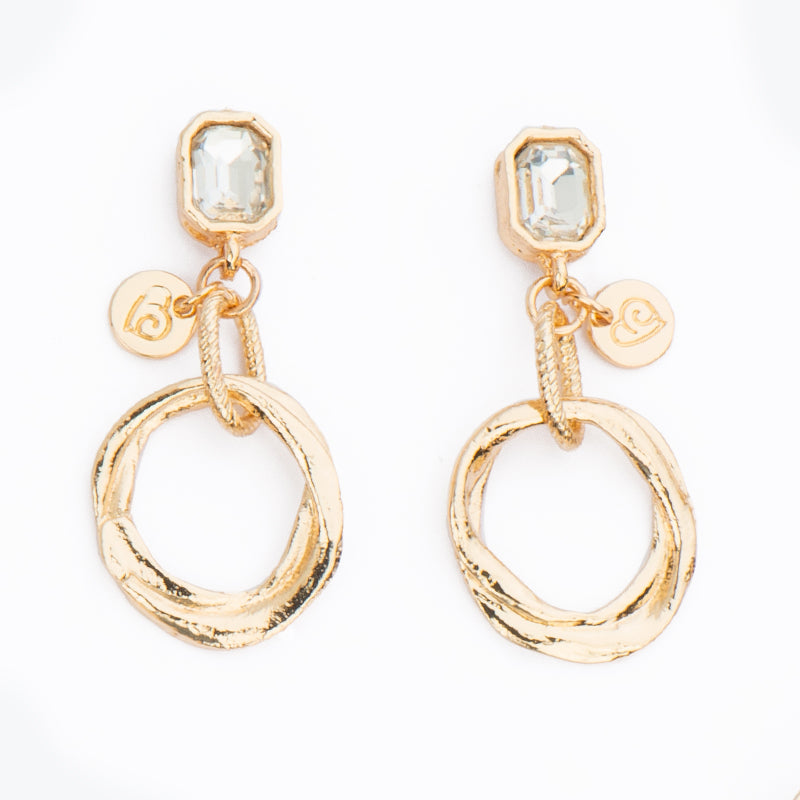 Questi orecchini con top ottagonale in cristallo clear sono completati da anelli pendenti in metallo martellato dorato: per un look sofisticato e ricco di texture.