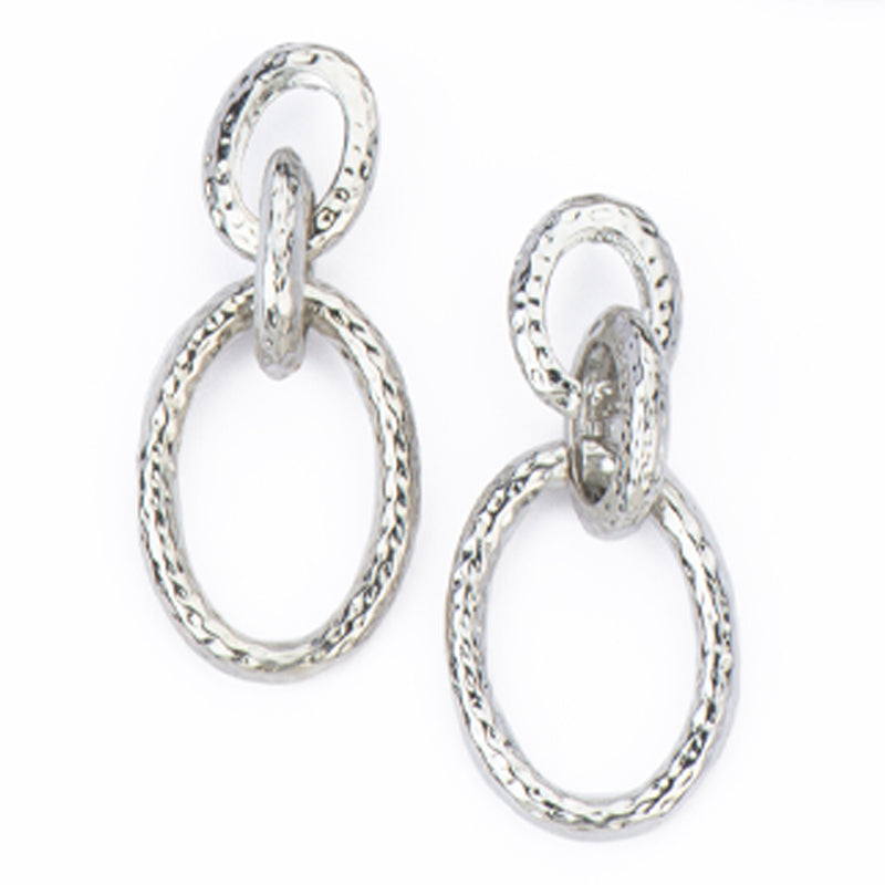 Questi orecchini con top e pendente a ovali tubolari in metallo martellato lucido offrono un design elegante, materico e dal fascino contemporaneo.