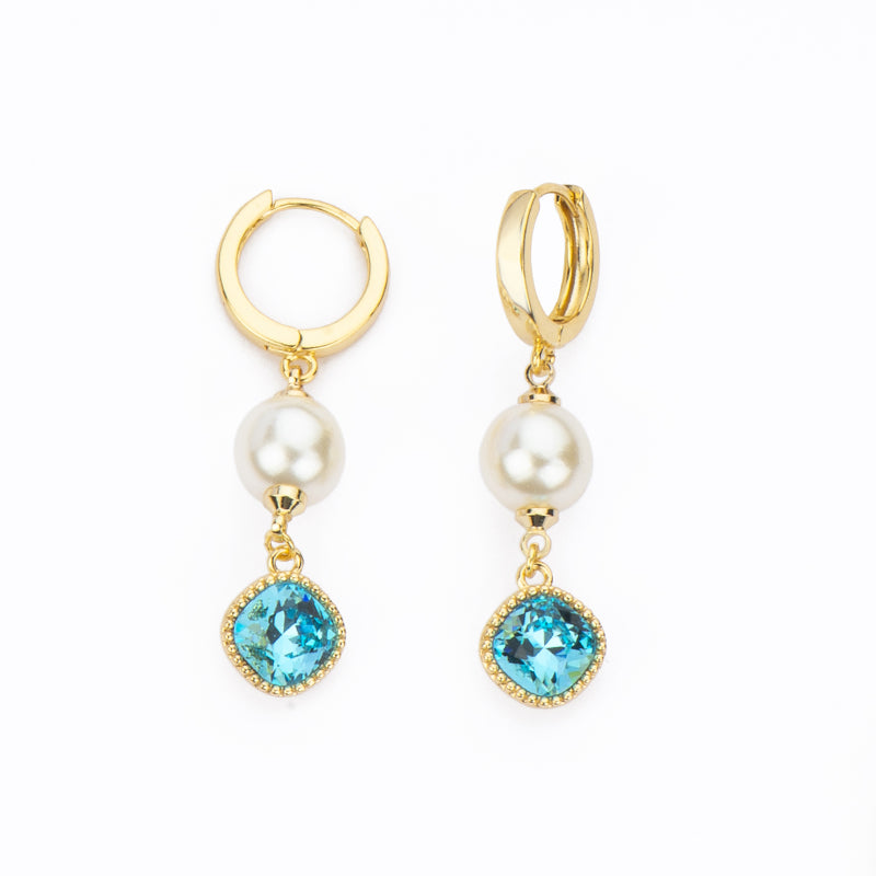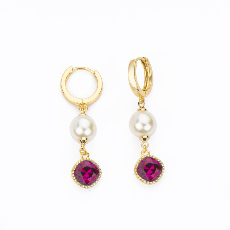 Orecchini a creola in metallo dorato con pendente in perla di vetro crema e cristallo fucsia/aquamarine.
