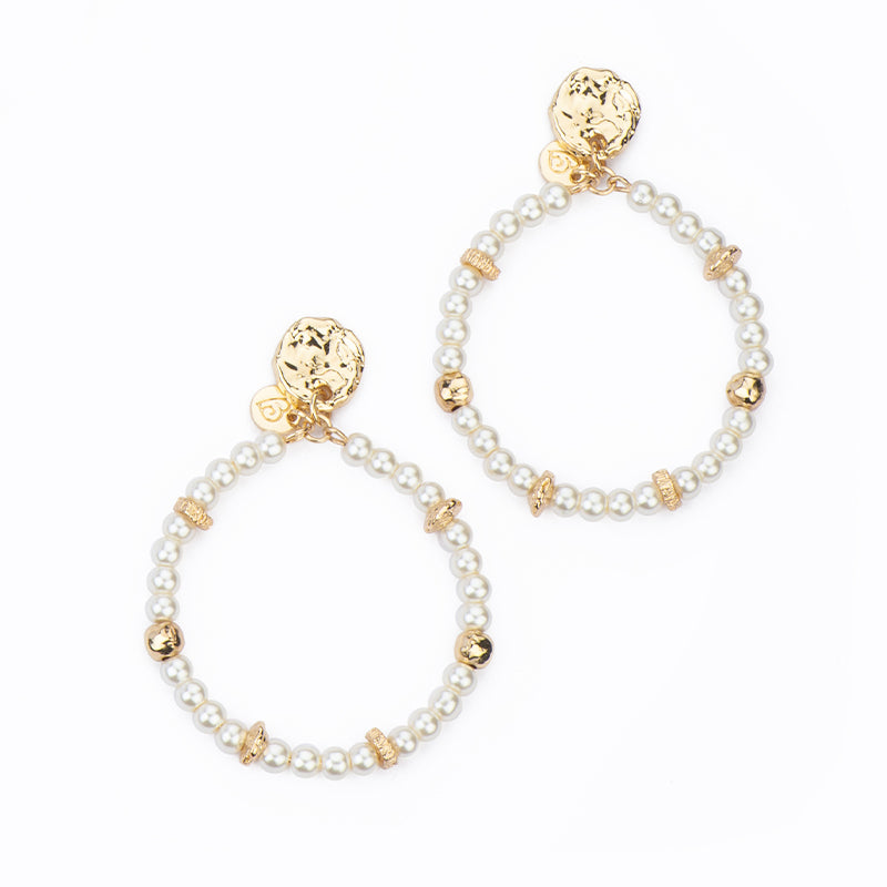 Questi orecchini con top rotondo martellato sono completati da un pendente con filo di perle intervallate da elementi in metallo dorato: per un effetto elegante, luminoso e dal fascino sofisticato.