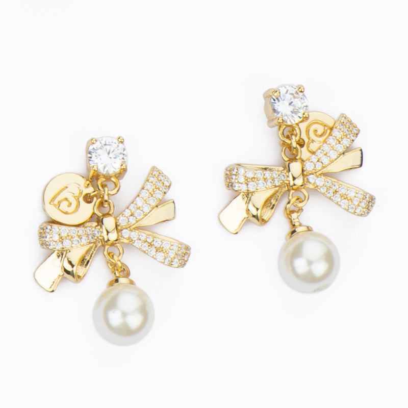 Questi orecchini uniscono un top in cristallo a un pendente a fiocco in metallo dorato con pavè di zirconi clear e perla di vetro crema: romantici e luminosi, con un tocco rétro.