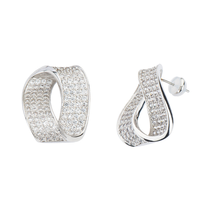 Orecchini con top a due fasce infinity in metallo rodiato/dorato con pavè di zirconi clear.