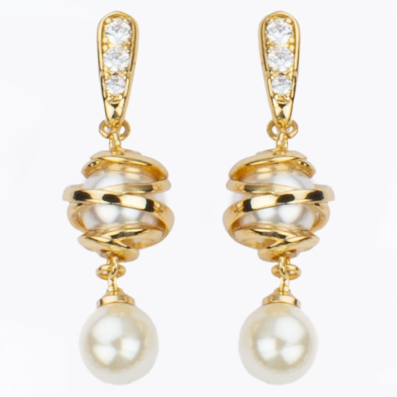 Orecchini con top in metallo dorato con zirconi clear e perle di vetro pendenti da 8 e 10mm.