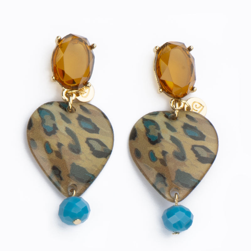 Orecchini con top ovale in resina sfaccettata topazio con pendente a stampa maculata e cristalli blu.