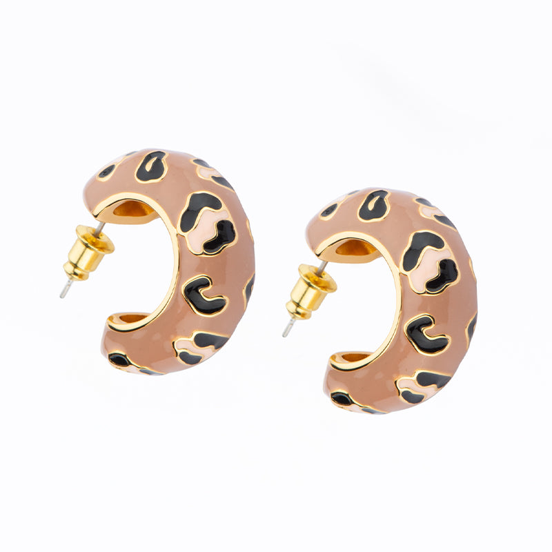 Questi orecchini a creola in metallo dorato accendono il look con l’energia dello smalto maculato: un dettaglio audace per chi ama distinguersi con stile.