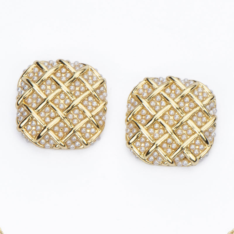 Orecchini con top in metallo dorato in texture trapuntata e perline incastonate.
