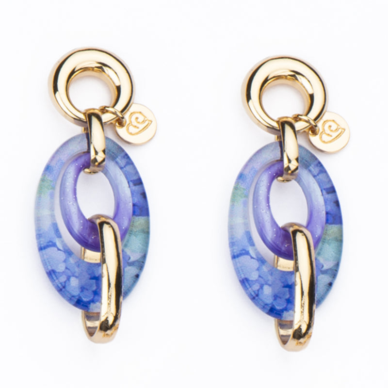 Questi orecchini con top ad anello irregolare in metallo dorato sono completati da pendenti ovali in resina a stampa Ortensia: per un effetto elegante, moderno e floreale.