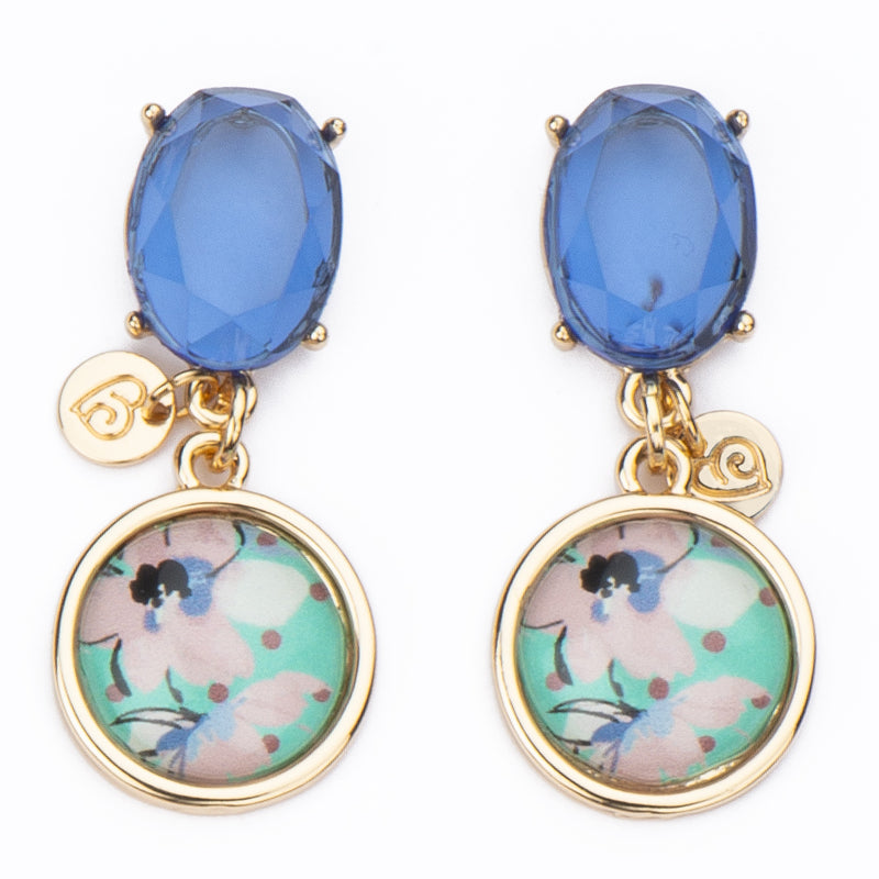 Orecchini con top in cristallo di resina zaffiro con pendente in resina stampa Pop Flower con frame in metallo dorato.