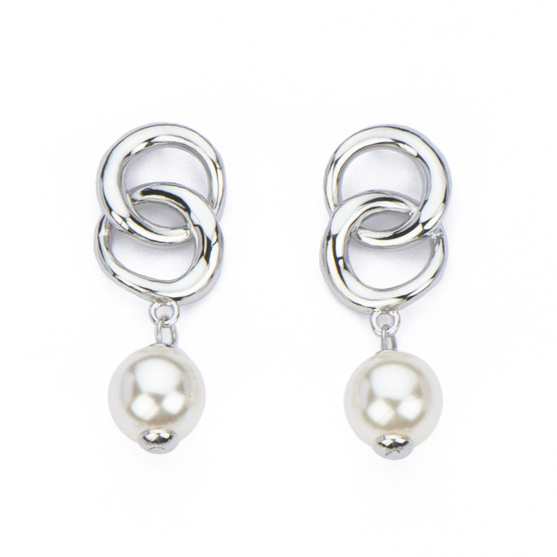 Questi orecchini con top a doppio anello in metallo sono completati da un pendente in perla di vetro color crema: per un effetto elegante, luminoso e senza tempo.