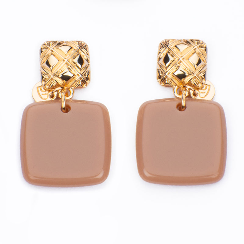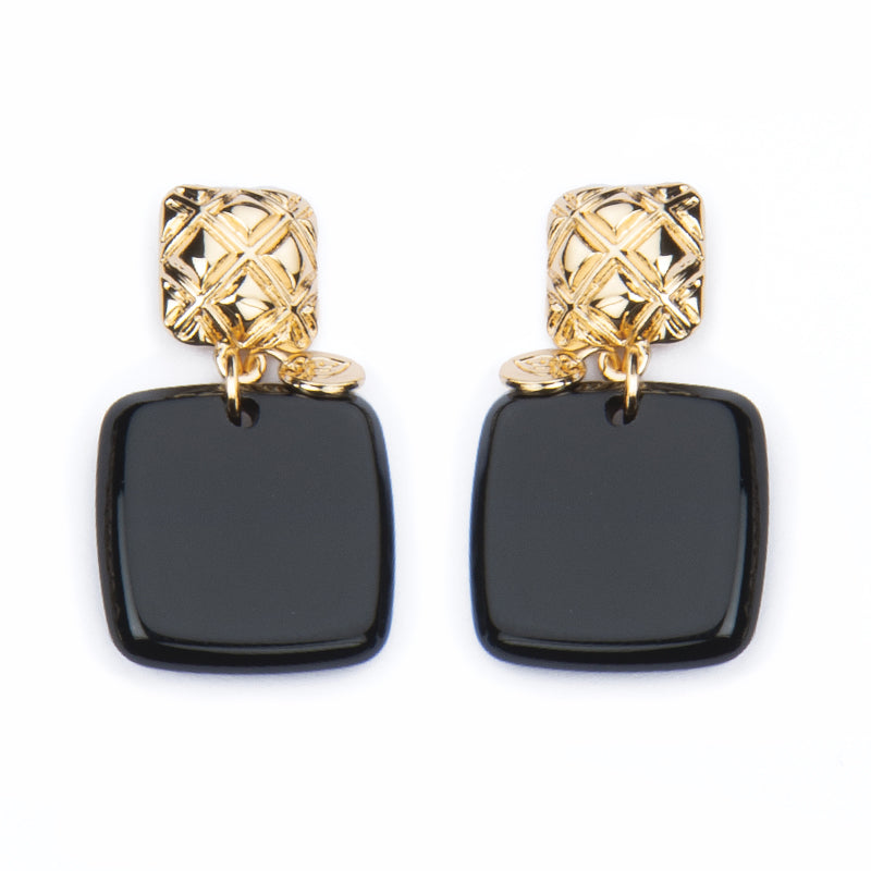 Questi orecchini con top carré in metallo dorato, bombato e impreziosito da una texture trapuntata, sono completati da un elegante pendente in resina che dona un tocco sofisticato e moderno.