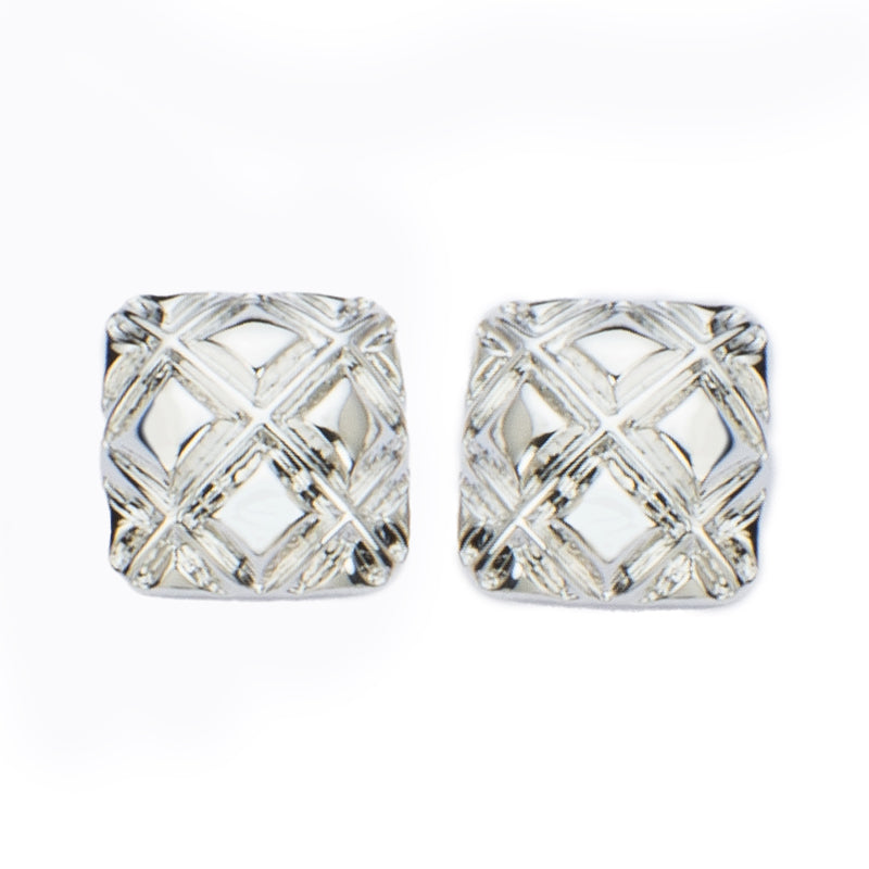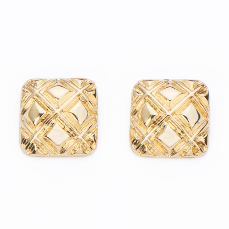 Orecchini con top quadrato in metallo, impreziositi da un'elegante texture in rilievo matelassé: geometrie decise, stile sofisticato.