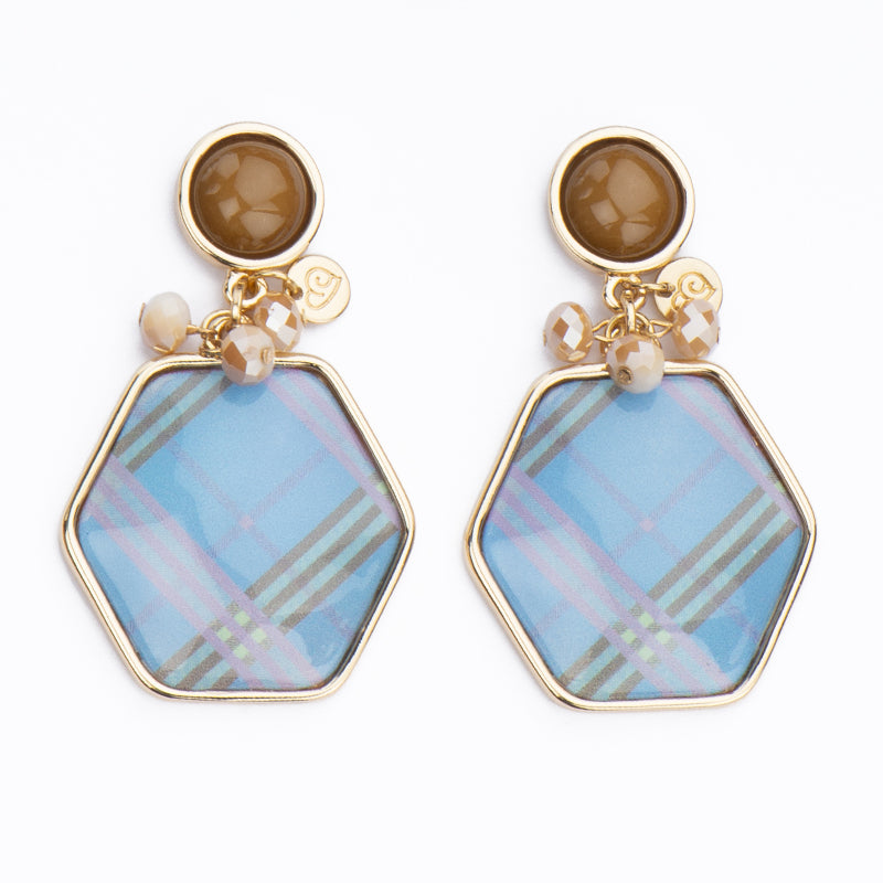 Questi orecchini hanno un top rotondo in resina biscuit con frame in metallo dorato, pendente a stampa Scozzese e cristalli crema: per un mix raffinato e originale.