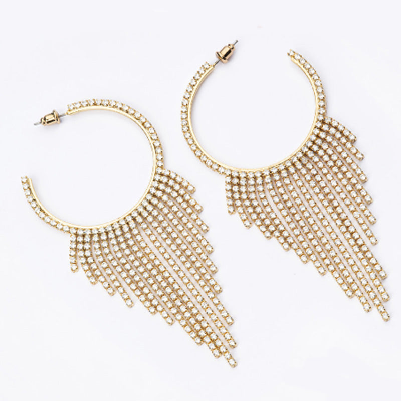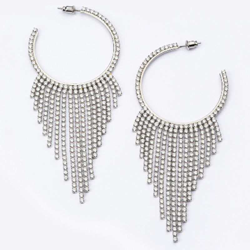 Questi orecchini a creola in cup chain brass presentano frange charleston degradé in zirconi clear: per un look dinamico e scintillante.