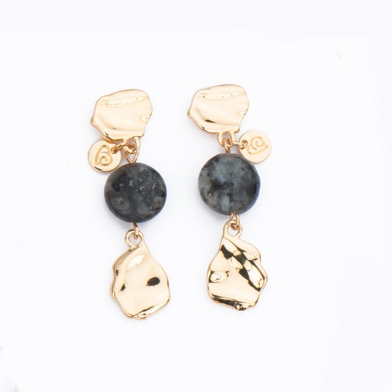 Questi orecchini con top in metallo dorato martellato si completano con un tondino in pietra dura grey jasper: essenziali, materici, naturalmente eleganti.