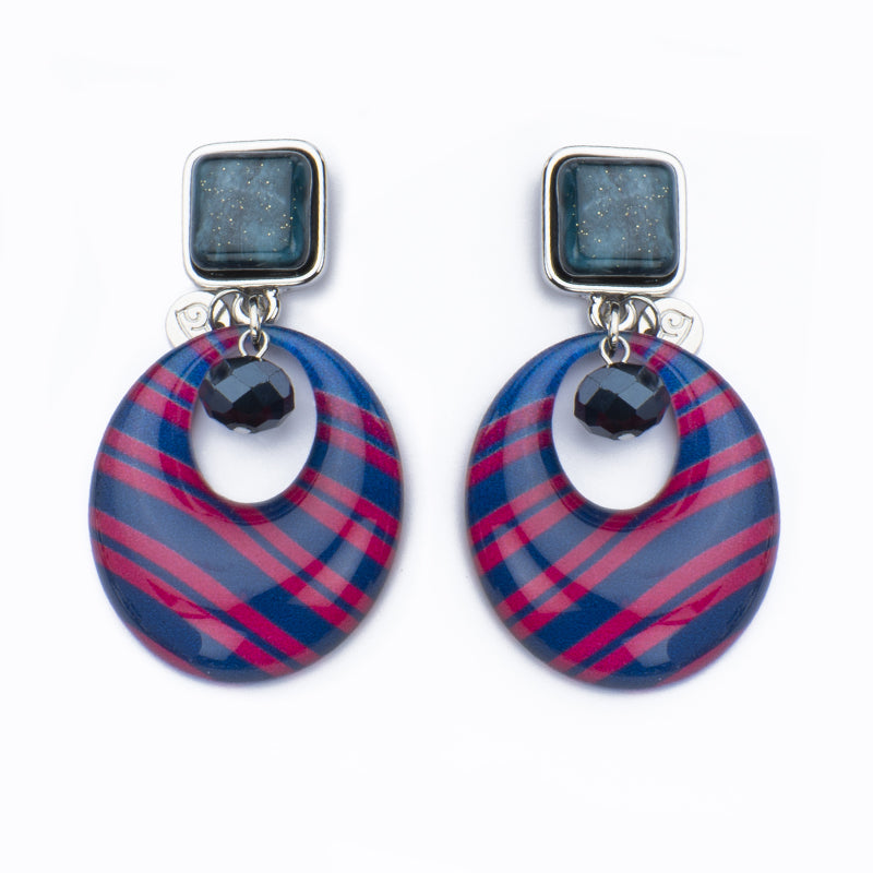 Questi orecchini con top a perno in resina micro glitter blu e frame in metallo rodiato si completano con un pendente a stampa Stripes Red&Blue: per un tocco brillante e audace.
