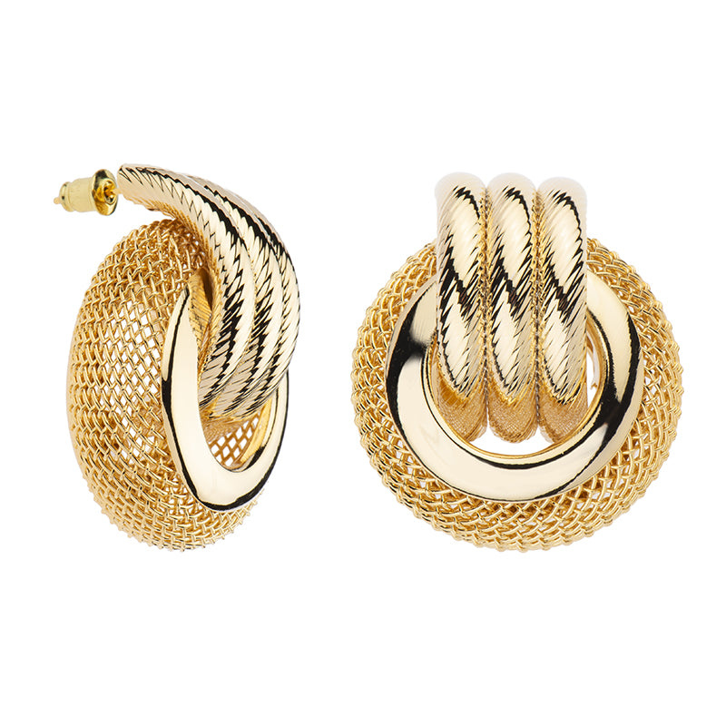 Questi orecchini dal design contemporaneo uniscono un top con tre tubicini a un elegante pendente a cerchio in rete di metallo liscio: per uno stile audace e raffinato.