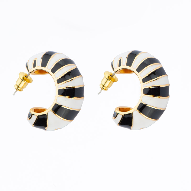 Orecchini a creola in metallo dorato con smalto zebrato.