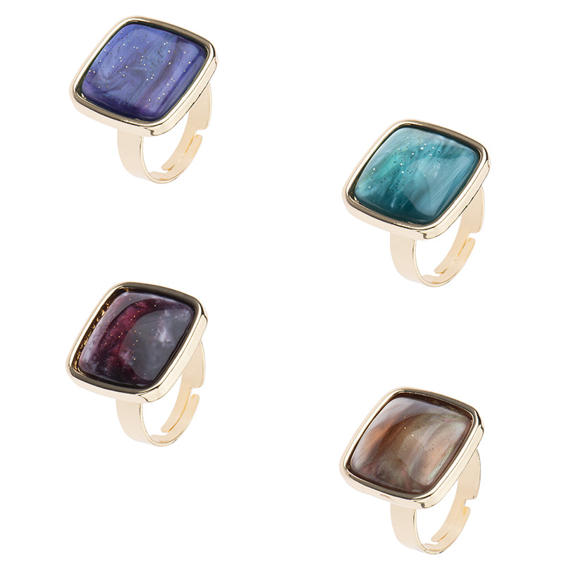 Set di anelli con top carrè in resina micro glitter violet, ottanio, wine e marrone, con frame in metallo dorato; 4 colori assortiti.