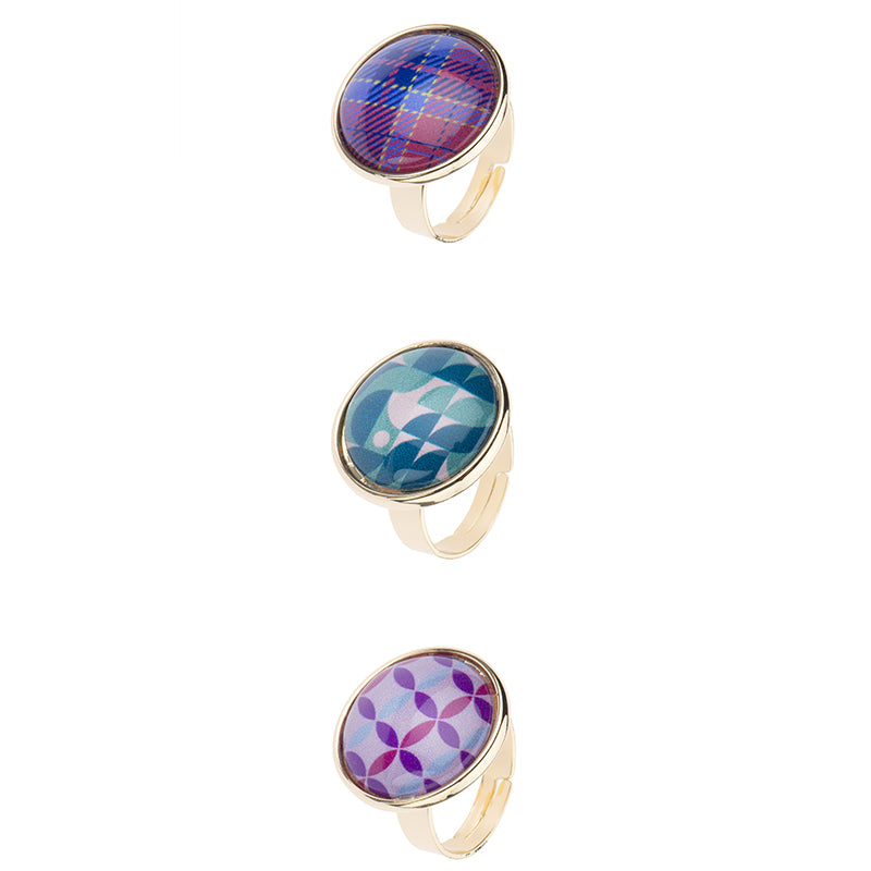 Set di anelli con top rotondo in resina stampa tartan e seventy con frame e gambo in metallo dorato; 3 colori assortiti.