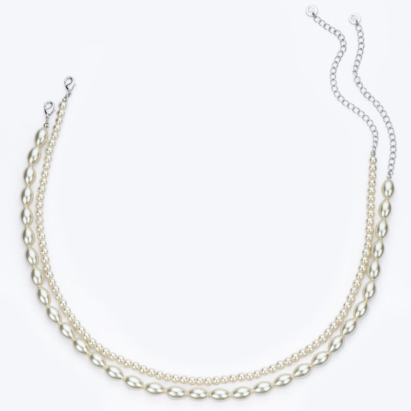 Questo set comprende 2 collane con perle di vetro: una tonda color crema da 5 mm e una a goccia da 12 mm. Eleganza doppia, stile unico.